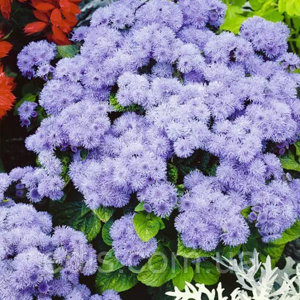 Насіння квітів: Агератум блакитнийАгератум блакитний має квіти небесного блакитного відтінку, завдяки якому стане вишуканою прикрасою клумб, садів, балконів, терас або присадибних ділянок. Даний сорт отримав широке поширення за рясне цвітіння, створює пишні блакитні хмари з приємним ніжним ароматом.