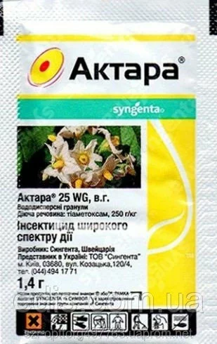 Актара - инсектицид кишечно-контактного действия, предназначен для защиты: зерновых культур, картофеля, свеклы, смородины, гороха, плодовых деревьев, овощных и цветочных культур. Хорошо подавляет вредителей: цикадок, тлей, трипса, белокрылок, плодожорок, медяницы, капустную муху, некоторых видов щитовок и ложнощитовок, колорадского жука и других насекомых. Свойства: Препарат активен быстро поглащается растением и проникает через листья и корни. Используется для большинства видов растительных культур. Стійкість до змивання дощем і сонячної інсоляції. Тривалий захисний ефект, збереження листового апарату. Низька норма витрати, зниження числа обробок, можливе внесення в грунт.Оплата та доставка