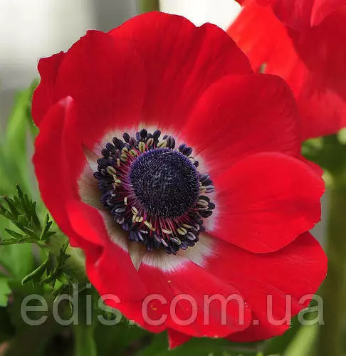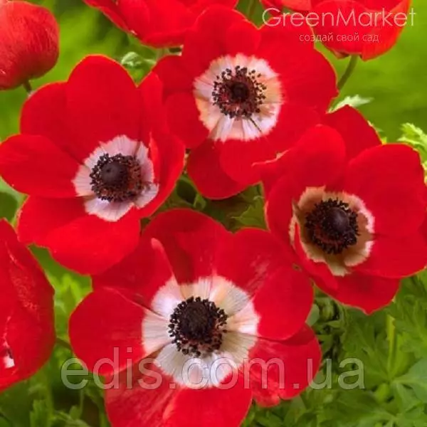 Анемона корончаста Hollandia (Голландія)Hollandia – це популярний сорт анемонів, який зустрічається в будь-якому саду чи парку щоліта. Їхні відкриті яскраво-червоні квіти складаються з 8 пелюсток з білим внутрішнім краєм, що створюють світле коло в центрі, що обрамляє чорні тичинки. Опис анемону Hollandia: висота в межах 20-25 см; діаметр розетки 8 см; посадка цибулин навесні чи восени; період цвітіння починається через 2 місяці після висадки в грунт; любить сонце та родючий грунт; боїться протягів і сильних морозів і при цьому зимує в ґрунті під укриттям. Вирощування анемонів досить просте при забезпеченні якісного поживного грунту і регулярного поливу. Висаджують цибулини на глибину 7-10 см при дотриманні проміжку між квітами не менше 15 см.