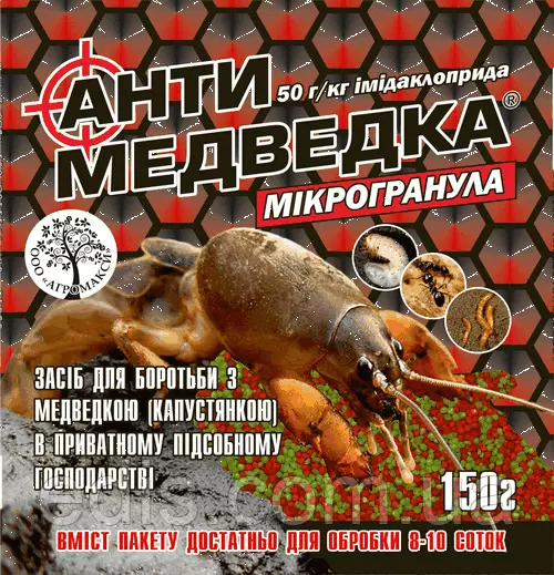Склад препарату: імідаклоприд 50 г/кг, зернова суміш (пшоно), цукор, барвник, ароматизатор, олія соняшникова.Призначення препарату: принада для боротьби з медведкою (капустянкою), дротяником, личинкою хруща на овочевих, квіткових культурах, полуниці та картоплі, для боротьби з садовими комахами-шкідниками під деревами і кущами, в теплицях і біля будівель.Оплата та доставка