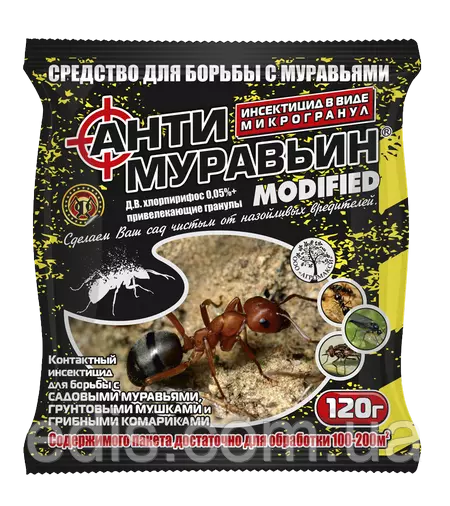 Призначення препарату: для боротьби з чорними садовими і рудими домашніми мурахами на доріжках, терасах і верандах будинків, у підсобних приміщеннях і на території навколо них. Склад: діюча речовина – хлорпірифос 0.3-0.5 г/кг, экструдатеры круп'яні, рослинне масло, заманник, барвник (Е122, Е132).Оплата та доставка