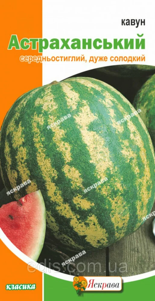 Кавун Астраханський 2 г Середньостиглийсорт. Рослинасередньоплетиста. Плід великий, темно-зелений з світло-зеленимисмугами, округлий, масою4 - 6кг. М'якотьчервона, щільна,ніжна, соковита, дуже солодка. Сорт відносностійкий до антракнозу, транспортабельний. Використовуютьу свіжомувигляді, маєлікувальнівластивості.Оплата та доставка