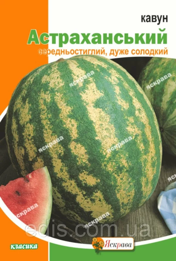 Кавун Астраханський 20 г Середньостиглийсорт. Рослинасередньоплетиста. Плід великий, темно-зелений з світло-зеленимисмугами, округлий, масою4 - 6кг. М'якотьчервона, щільна,ніжна, соковита, дуже солодка. Сорт відносностійкий до антракнозу, транспортабельний. Використовуютьу свіжомувигляді, маєлікувальнівластивості.Оплата та доставка