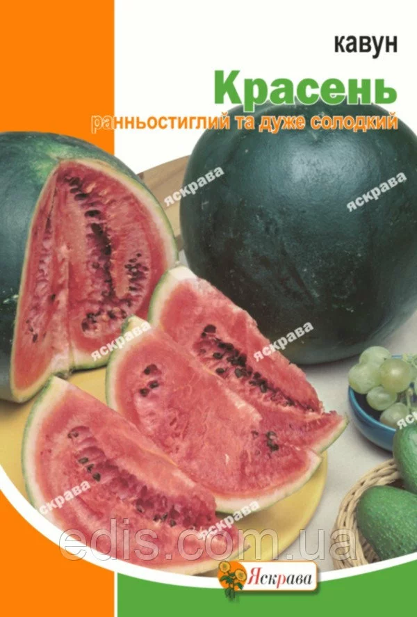 Кавун Красень 20 г Ранньостиглийсорт. Вегетаційнийперіодвідсходів до технічноїстиглості65-67днів. М'якотьнасичено-червона,зерниста,ніжна, соковитаідуже солодка. Плодиокруглі, темно-зелені , вагою4-6кг. Сортцінуєтьсязахорошу врожайністьранньої продукції, великий вмістцукруітранспортабельність.Оплата та доставка