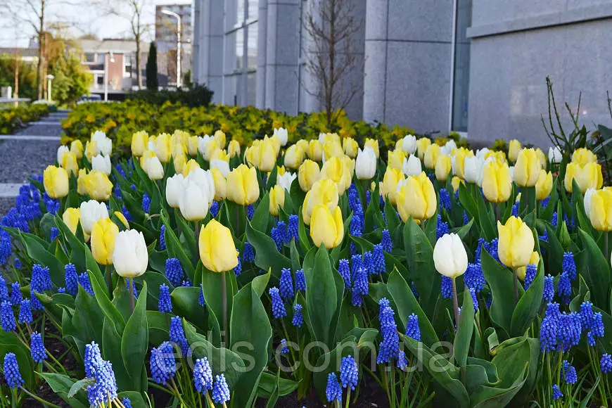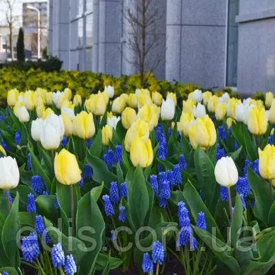 І тепер у Вас є така можливість! Світлі бутони тюльпанів, немов зірки, засяють на Вашій клумбі. Вигідно підкреслять їхню красу насичено-сині мускарі.