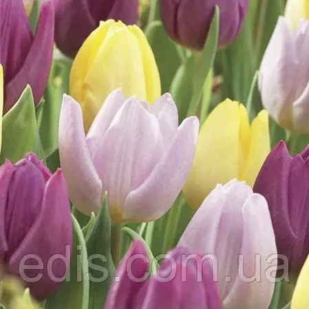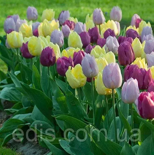 Цибулини квітів: Набір цибулин тюльпанів Фолк.Жовтий, бузковий, фіолетовий і червоний – дуже яскраве, але гармонійне поєднання.