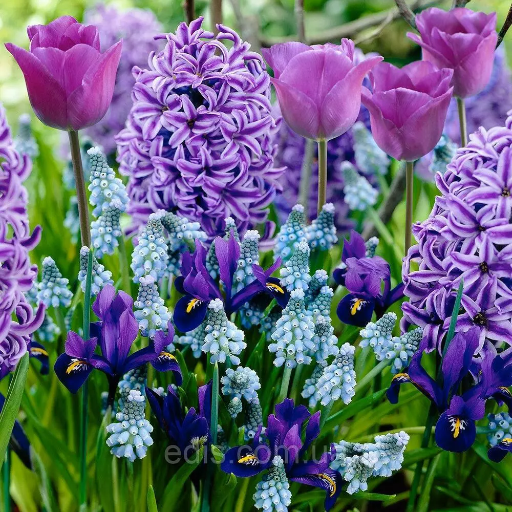 Цибулини квітів: Набір цибулин Синій туманСиній, блакитний, бузковий кольори завжди привертають увагу, ваблять погляд і в саду не обійтися без них. Останнім часом стало модним розділяти сад на колірні ділянки. Це дуже цікава ідея. Ми не змогли залишитися осторонь і – ось вам ідея для весняної синьою клумби або квіткового горщика!