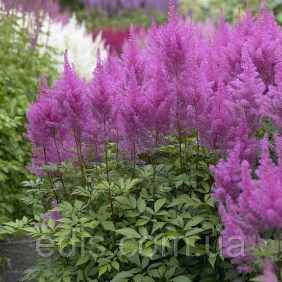 Саджанці багаторічних квітів для саду: Астильба Глорія Пурпуреа.Квітки 3-4 мм в діаметрі, зібрані в фіолетово-рожеве (при відцвітанні - синеющее) ромбическое суцвіття, розміром 8х17 див.