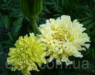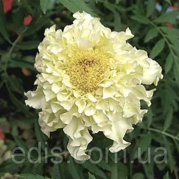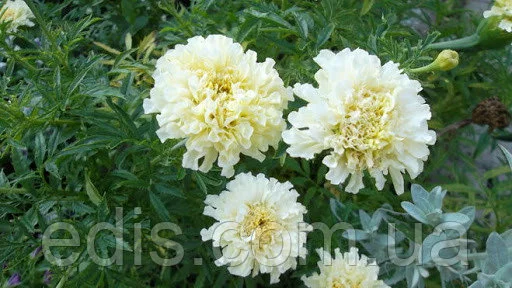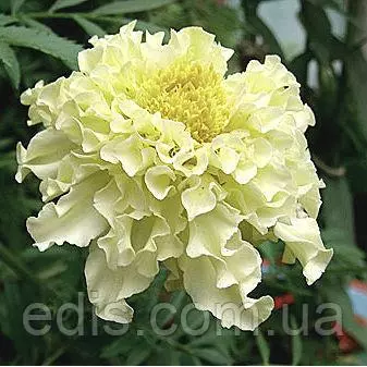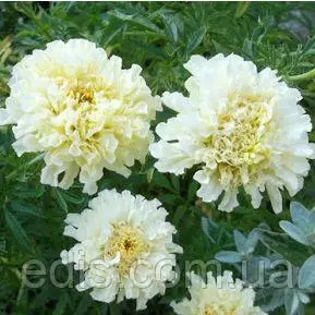 Насіння квітів: Чорнобривці прямостоячі КіліманджароКилиманджаро – один из самих эффектних сортів в своєму підвиді Чорнобривців Африканських или Прямостоячих. Ця группа сортів була створена спеціально для зрізки. Кущі крупні, в висоту можуть досягати больше 1 метра, але при цьому стебла дуже міцні, прямостоячі. Квіти однотонні кремово-білі, махрові, дуже цікавої ажурної структури завдяки хвилястим широким пелюсткам, дуже крупні – в идеальних умовах діаметр квітів може бути до 15 см. Цвітіння рясне, безперервне, з червня до сильних морозів.