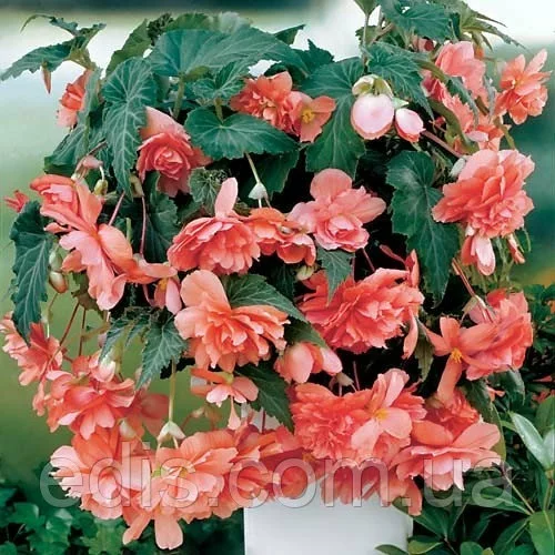 Бегонія Ампельна Лососева У відкритий грунт ампельну бегонію висаджують, коли мине загроза заморозків і після обов'язкового загартовування рослин. Бегонії люблять багаті органікою, повітропроникні грунту. Для успішного розвитку рослин необхідно підтримувати вологість грунту, уникаючи при цьому застою води. З настанням вересня підгодівлі припиняють. Пізньої осені поступово починає відмирати наземна частина рослини. Після загибелі від заморозків або всихання верхній частині рослини, бульби викопують, очищають від залишків та землі. Ампельної бегонією прикрашають і садові клумби і квітники міст, селищ, ампельні форми бегоній просто ідеально підходять для вирощування в контейнерах, підвісних корзинах і горщиках. На вулиці кущі ампельних бегоній особливо вигідно виглядають в контейнерах піднятих високо над землею. А якщо посаджені рослини різних забарвлень, то це стає схожим на салют, тільки з живих квітів.Оплата та доставка
