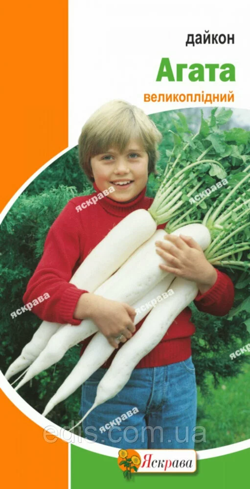 Дайкон Агата 2 гСередньоранній (60-75 днів від сходів до технічної стиглості) сорт. Коренеплід целиндрический довжиною 35-40 см, діаметром 5-8 см, гладкий, основний колір білий. М'якоть дуже соковита, ніжна сніжно-біла, цілісної консистенції, углобленность у грунт на 1/3-1/2 довжини коренеплоду, легко висмикується. Маса коренеплоду - 570-2200 р. Смак хороший, освіжаючий, солодкуватий, без гострого присмаку. Відносно стійкий до слизовому бактеріозу. Придатний для тривалого збереження в зимовий період. Вирощується у відкритому і защищеной поштою. Посів проводять в два рядок з кінця квітня або в іншій половині липня за схемою 8-10*20 див. Врожайність - 5-7,5 кг/метр квадратний.Оплата та доставка