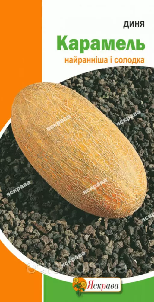 Диня Карамель 1 гРанньостиглий сорт. Вегетаційний період від сходів до технічної стиглості 60-80 днів. Самий раній сорт типу «Ананас» (раніше Амала на 5-7 днів, формою та іншими показниками дуже схожі). Форма плоду овальна масою 1,8-2,5 кг, з великою, яскраво вираженою сіткою на шкірці. М'якоть білого кольору з сильним ароматом. Насіннєва камера дуже маленька. Стабільне формування плодів в стресових умовах. Стійкий до фузаріозу. Високий ранній урожай, відмінний смак, ранньостиглість - головні переваги дині Карамель!Оплата та доставка