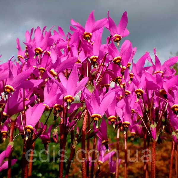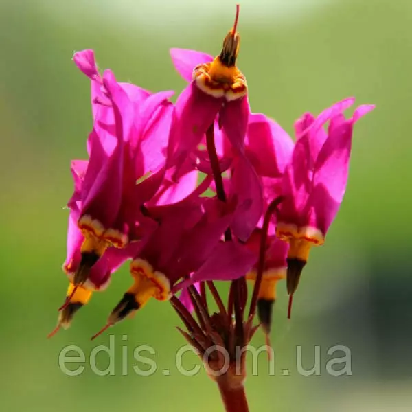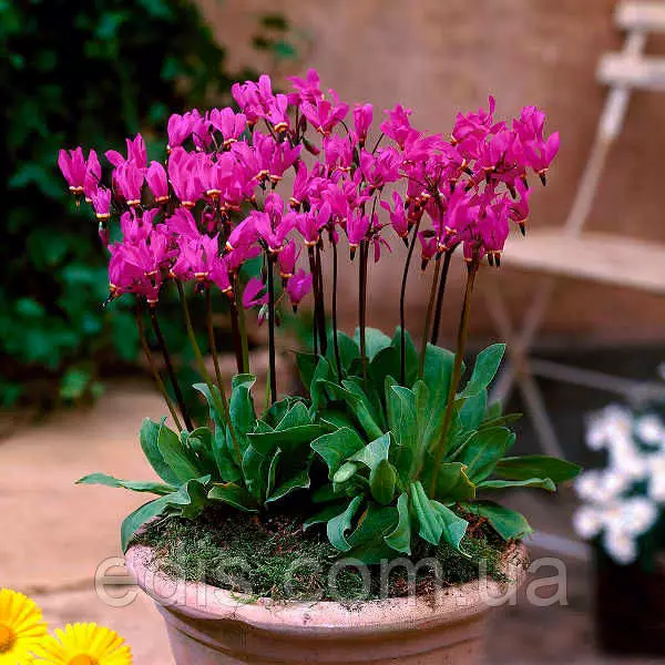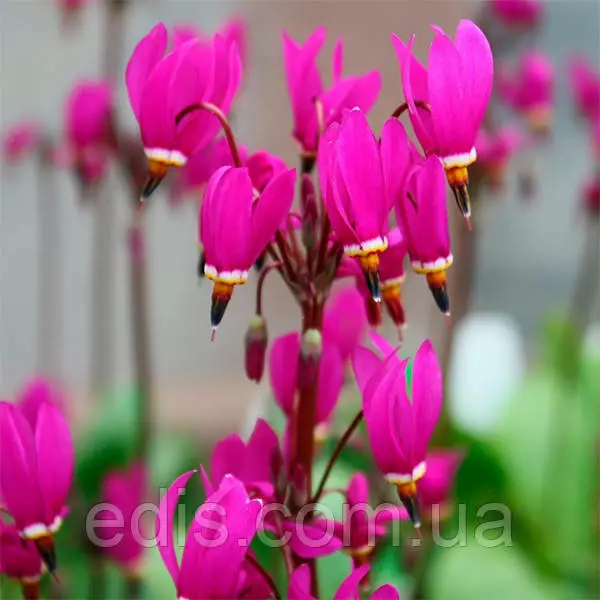Додекатеон Red WingsДодекатеон – це рід трав'янистих квіткових багаторічників з родини Первоцвітих. На відміну від більшості весняних квітів, Додекатеон відрізняється надзвичайно тривалим цвітінням. Розквітають додекатеоны разом з тюльпанами і нарцисами в травні і квітнуть не менше місяця. Дорослий кущ дає більше двадцяти квітконосів, тому, незважаючи на невеликий розмір окремої квітки, загалом кущ додекатеона може бути акцентом, привертає увагу. Сам квітка за формою нагадує квітку цикламена з сильно відігнутими пелюстками. Виглядає екзотично.
