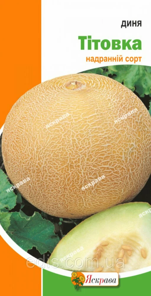 Диня Тітовка 2 гРанньостиглий сорт. Вегетаційний період від сходів до технічної стиглості 60-80 днів. Перспективний сорт, дозрівання плодів за 55 - 70 днів. Транспортабельний. Врожайність - 90 - 100 ц. Плід округлий або короткоовальный, жовто-оранжевого кольору, з сегментами губою сітки, масою 1,5 - 2 кг М'якуш товстий, білий, ніжний, солодкий, запашний, слабо волокнистий. Вміст цукру - 6,8 %, сухих речовин - 10,4 %. Використовується у свіжому вигляді.Оплата та доставка