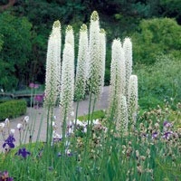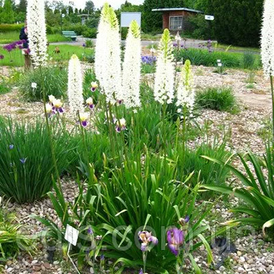 Eremurus (Ширяш) гібридний Shelford (Шелфорд)Назва цього дивовижного екзотичної рослини перекладається як "Пустельний хвіст" і буквально описує його зовнішній вигляд. Eremurus – це багаторічна бульбі-кореневищна рослина з величезними білими колосоподібними суцвіттями. Окремі квіточки Эремуруса – це дрібні дзвіночки, щільно розташовані на величезній колосі. Характерна особливість Єремурус – їх суцвіття починає цвісти знизу вгору, завдяки чому зберігає ідеальну декоративність максимально довгий час. Кожен окремий квіточка цвіте лише 1-2 дні, але в суцвітті їх так багато, що відкриваючись один за одним по спіралі знизу вгору вони продовжують загальне цвітіння близько 40 днів. До того ж, цвітіння Эремуруса приваблює безліч метеликів та інших корисних комах в сад.