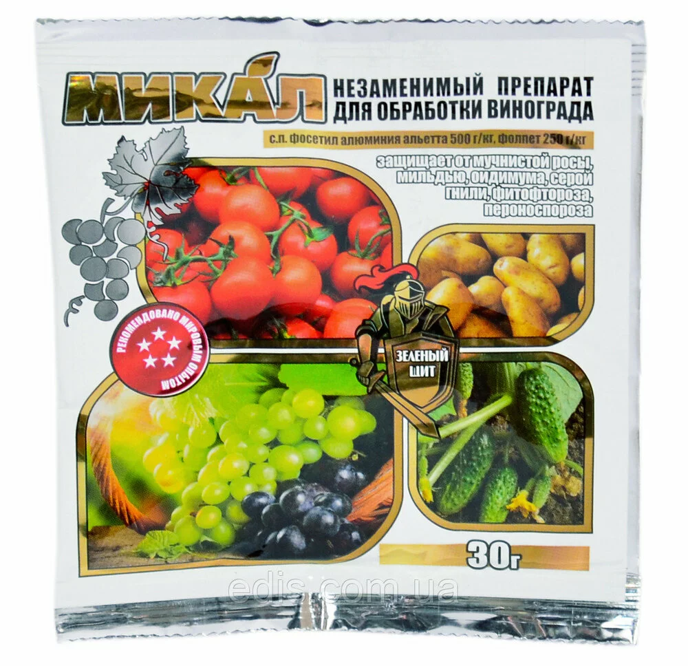 Фунгіцид для винограду МікалФунгіцид контактно-системної дії для захисту виноградників від мільдью, сірої гнилі, оїдіуму, борошнистої роси та іншими хворобами. Діюча речовина: фоцетил алюмінію альетта 500г/кг, фолпет 250г/кг Препаратная форма: порошок, що змочується. Призначення: препарат контактно-системної дії для застосування на виноградній лозі і овочевих культурах для захисту від комплексу захворювань. Механізм дії: Микал – контактно-системний фунгіцид захисної та частково лікувальної дії. Фосетил алюмінію швидко проникає всередину рослини і переміщується з низхідним і висхідним потоком; посилює імунітет рослини і блокує проростання грибних спор. Фолпет залишається в поверхневих тканинах оброблених рослин і викликає плазмолиз, а потім розпад міцелію патогена. Швидкість впливу: завдяки високій швидкості проникнення в рослину дія препарату настає в перші години після застосування. Фітотоксичність: проведені численні випробування препарату Мікал в рекомендованих нормах витрати не виявили випадків прояву фітотоксичності по відносинам до оброблюваних культур. Селективність: Микал володіє досить високою вибірковістю дії. Токсикологія: препарат має 3 клас небезпечності (помірно небезпечний в-во). Препарат не фітотоксичний при використанні в суворій відповідності з рекомендаціями. Препарат малоопасен для бджіл (3 клас небезпеки). Дозволяється застосування препарату у санітарній зоні рибогосподарських водойм. Заходи безпеки: при роботі з препаратом необхідно застосування засобів індивідуального захисту шкірних покривів, очей та органів дихання (захисні окуляри, респіратор або ватно-марлева пов'язка, гумові рукавички, халат бавовняний, головний убір). Обробку слід проводити у відсутність дітей і тварин. Для приготовления рабочего раствора не использовать пищевую посуду. Во время работы не пить, не курить, не принимать пищу. После работы вымыть лицо и руки с мылом, прополоскать рот. Освободившуюся тару закопать вдали от жилых построек. Упаковки запрещается выбрасывать в канализацию и места сбора бытового мусора, оставлять на поверхности почвы и бросать в водоемы. Первая помощь: удалить загрязненную одежду. При вдыхании обеспечить пострадавшему покой и приток свежего воздуха, в случае необходимости искусственное дыхание. При попадании на кожу: снять загрязнения ватой или куском ткани, обмыть кожу большим количеством воды с мылом. При попадании в глаза: промыть большим количеством проточной воды. При случайном проглатывании: выпить несколько стаканов воды с активированным углем (1 г/кг массы тела) и принять солевое слабительное (20г сернокислой магнезии на полстакана воды). При всех случаях отравления обратиться к врачу. Лечение симптоматическое, антидот отсутствует. Хранение: хранить в сухом прохладном месте, отдельно от пищевых продуктов и лекарств, в местах, не доступных для детей и домашних животных. Температура зберігання від -30 С до +30 С. Спосіб застосування: у відповідності з нормативами, кількість препарату розвести в невеликій кількості води, а потім, помішуючи, додати воду, що залишилася. Обприскувати рослини свіжоприготовленим розчином у суху безвітряну погоду, рівномірно змочуючи листя. Нормативи: для винограду від мильдьи, борошнистої роси, оїдіуму, сірої гнилі обприскування в період вегетації робоч