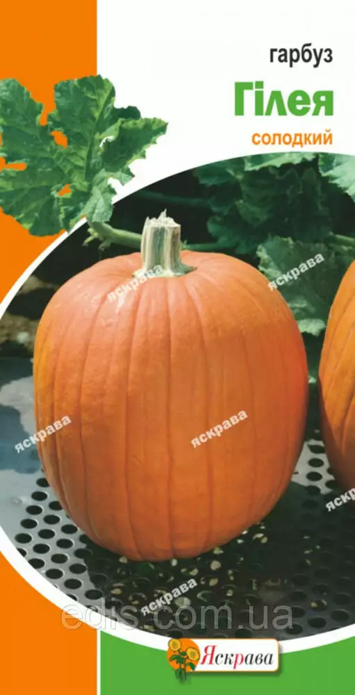 Гарбуз Гілея 3 рСередньостиглий сорт мускатного гарбуза, призначений для вирощування на сухому ґрунті і при зрошенні, універсального напрямку використання, придатний для переробки на дієтичні продукти харчування. Від сходів до початку дозрівання плодів 95-105 днів.Плоди округлі, коротко циліндричної та овальної форми, оранжевого кольору з рожевим відтінком і восковим нальотом. Шкірочка тонка, шкуристая. М'якоть червоно-оранжевого кольору, товста, хрустка, соковита, солодка. Маса середнього плоду-6-9 кг. Транспортабельність хороша. Урожай може зберігатися до 1 року.