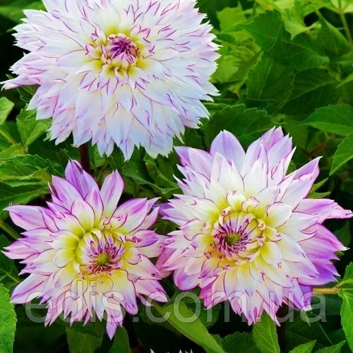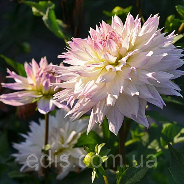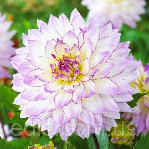 Жоржини: Жоржини Crasy LoveДекоративна жоржина Crasy Love відрізняється ніжним забарвленням. Її білі пелюстки обведені бузковим відтінком. Пуп'янок розкривається поступово, тому центр квітки залишається бузковим.