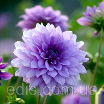 Бульби садових квітів: Жоржини декоративна Блю Бой.Великі лавандово-бузково-блакитні квіти на міцних квітконіжках, спрямовані вгору. Хороший сорт для зрізки.