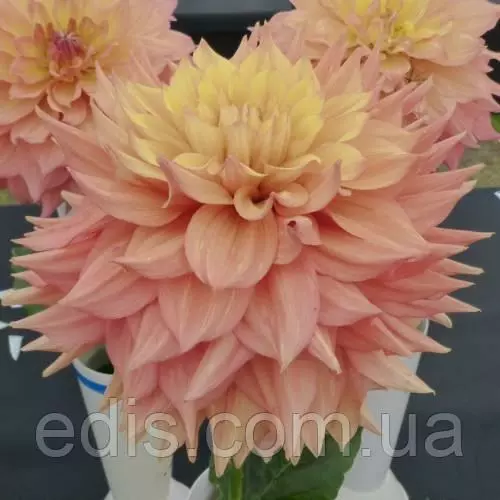 Георгины: Георгина гигантская ДжессиИзысканный цветок георгины Jessy пастельно-розового оттенка отличается оригинальным желтым окрасом сердцевины и крупным размером, достигающим 30 см в диаметре. Данный сорт используют для украшения клумб, садов и городских парков, а также для создания оригинальных букетов.