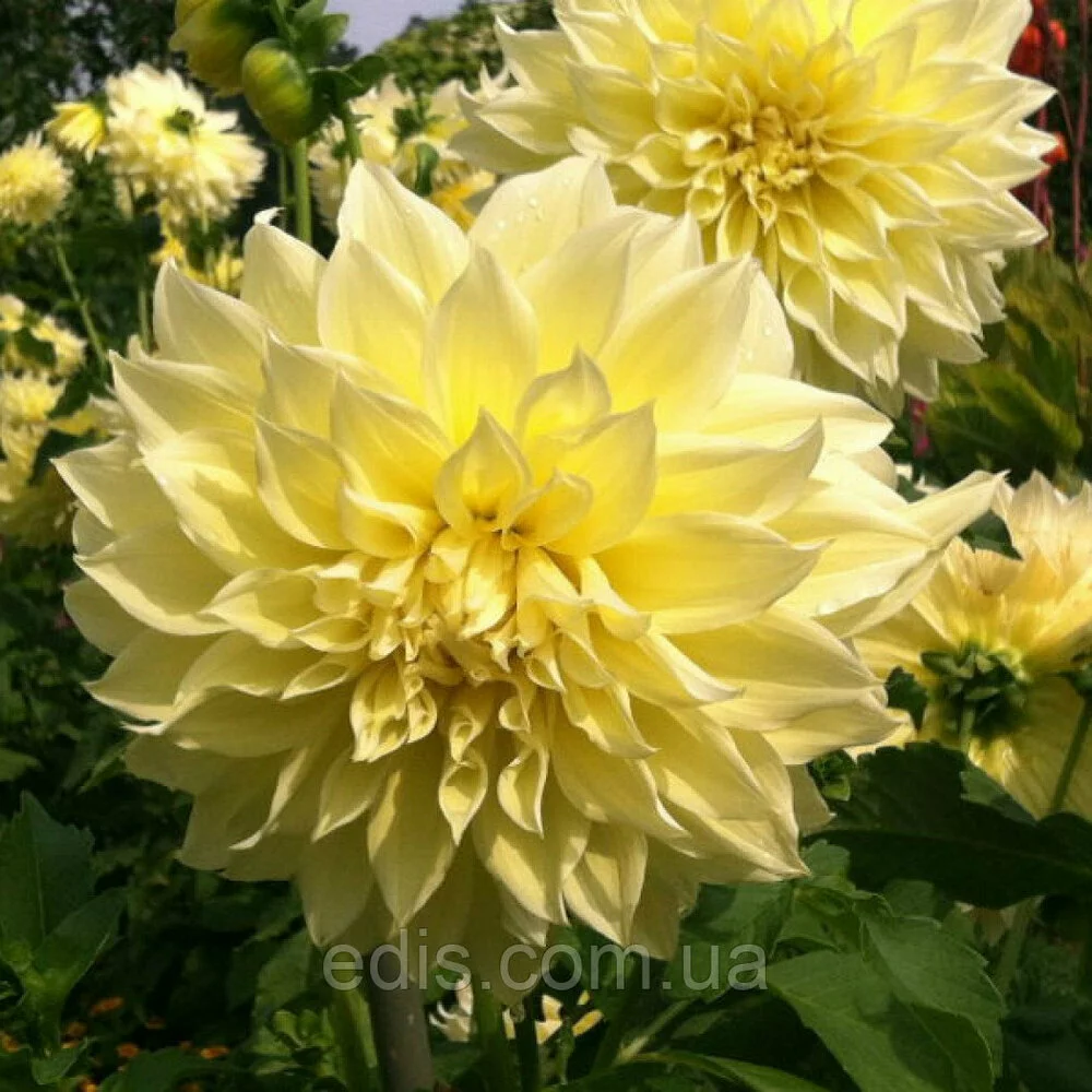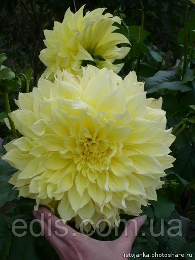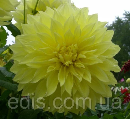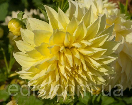 Жоржини: Жоржина з гігантськими квітками Kelvin FloodlightСолнечная георгина Kelvin Floodlight любима садоводами по всей Украине. Ее огромные желтые соцветия вырастают до 30 см в диаметре, благодаря чему она получила название георгина-гигант. Этот сорт незаменим и для составления букетов.