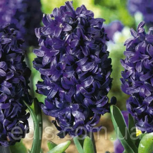 Гіацинт східний Аїда (фіолетово-чорний)Темно-фіолетовий Гіацинт східний Аїда – це самий "чорний" новий сорт. Висота рослини 25-30 див, висота суцвіття 12-15 див. В щільному суцвітті до 32 квіток 3,5 см в діаметрі кожен. Забарвлення чорнильно-фіолетовий, більш темний по центру пелюсток.