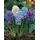 Гіацинт Blue Eyes (Блу Айс)Гіацинт Блу Айз - дуже цікавий за забарвленням сорт. Квітки ніжно-блакитні з білим горлом, відтінки блакитного згодом трохи змінюються, грають, що додає краси. Квітки великі, до 4 см. в діаметрі, зібрані в качан довжиною 12-15 см., Квітконос до 30 см заввишки. Гіацинт – універсальна квітка. Його легко вирощувати і на клумбі, і в горщиках. Квітучі серед зими ароматні, яскраві гіацинти у горщиках – чудовий подарунок. Ціна готових до цвітіння гіацинтів у горщиках досить висока. Якщо у вас є холодний балкон або підвал, де можна в холоді та темряві тримати горщики з цибулинами гіацинтів для вкорінення - купуйте в нашому інтернет-магазині цибулини гіацинтів та інших весняних цибулинних квітів і виростіть свою весняну клумбу самостійно!