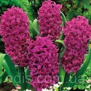 Гіацинт горщиковий WoodstockГіацинт Вудсток (Woodstock), з щільним високим (10-15 см) суцвіттям, великими фіолетово-малиновими квітами, і малиновими кінчиками листя. Володіє приємним тонким ароматом. Гіацинт Вудсток – один з кращих сортів сучасної селекції, оптимальний для вигонки в домашніх умовах