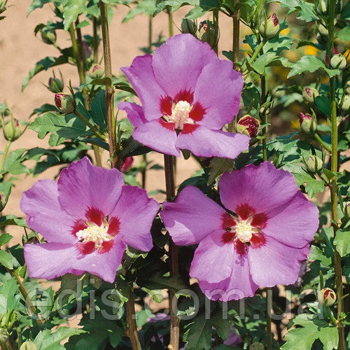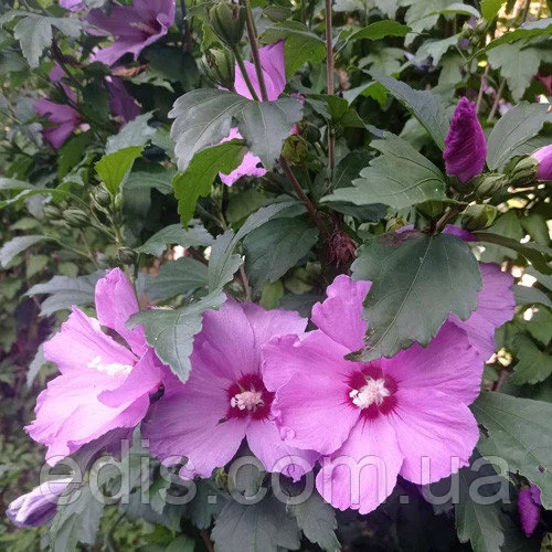 Гібіскус деревовидний ЛіловийЛистопадний чагарник. Висота і діаметр крони може досягати 3 м. Квітки великі, 6-10 см в діаметрі, дуже схожі на квітки мальви – вони шовковисті, часто з темною плямою біля основи пелюсток. Морозостійкий – здатний переносити морози до -29°C (при умові обов'язкового укриття за типом винограду або клематиса). Цвітіння з серпня по жовтень.