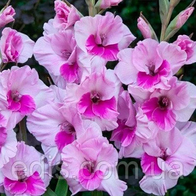 Цибулини квітів: Гладіолус великоквітковий АланнаГладіолус Аланна - сучасний великоквітковий зрізочний сорт. Квіти рожеві з контрастним пурпуровим язичком, великі, гофровані, щільно розташовані на стеблі. Цей сорт гладіолусів названий в честь канадської рокспівачки Аланне Майлз.