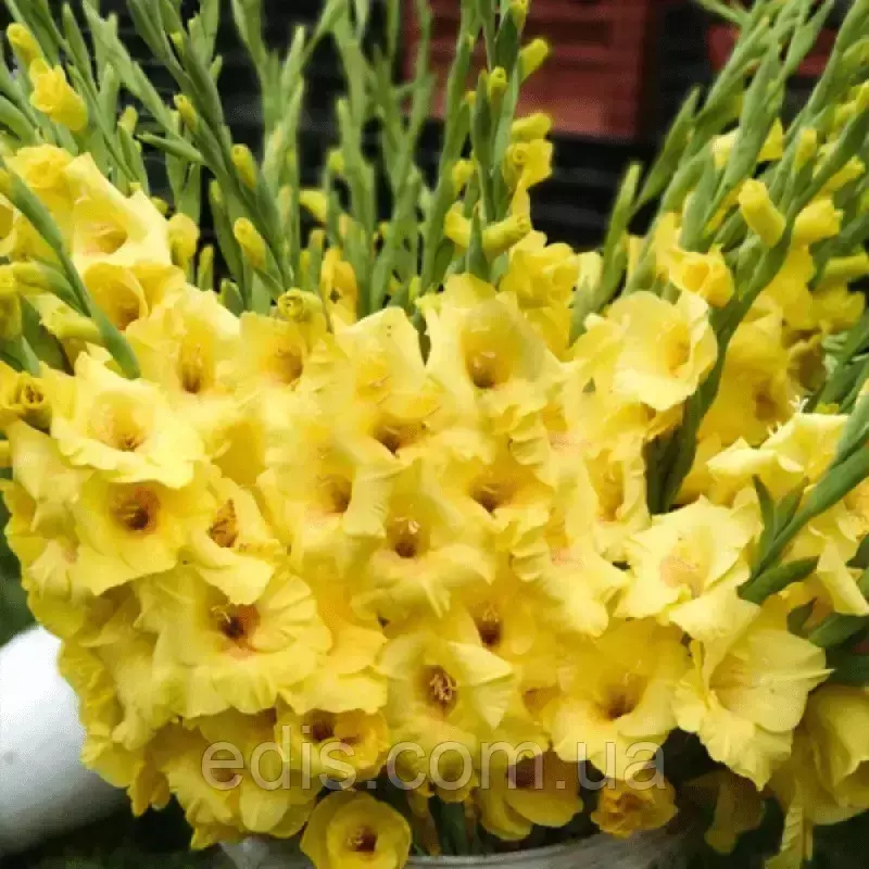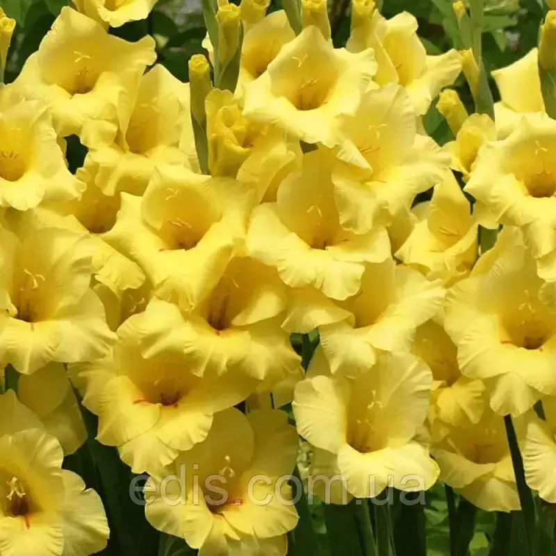 Гладіолус Великоквітковий BananaramaБананарама - представник ранніх великоквіткових жовтих гладіолусів. Висота стебла 130-140 см. Одночасно тримає розкритими 6-7 квіток.