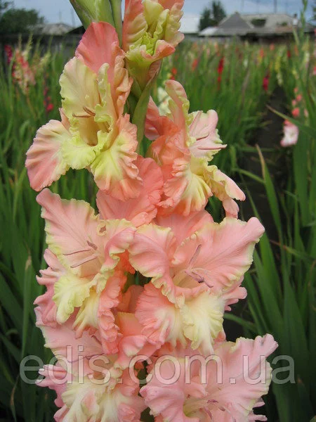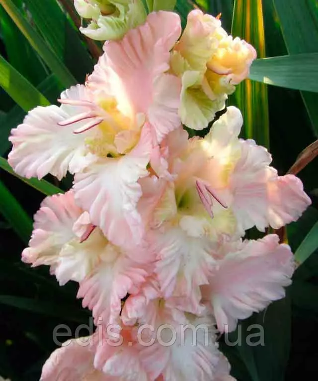 Гладіолус Наташа.Великі, сильно гофровані квіти. Основне забарвлення пастельно-рожева, нижній пелюстка кремовий з салатовим відтінком. Три внутрішні пелюстки з салатовою хвилястою окантовочкой. Дуже приваблива забарвлення!