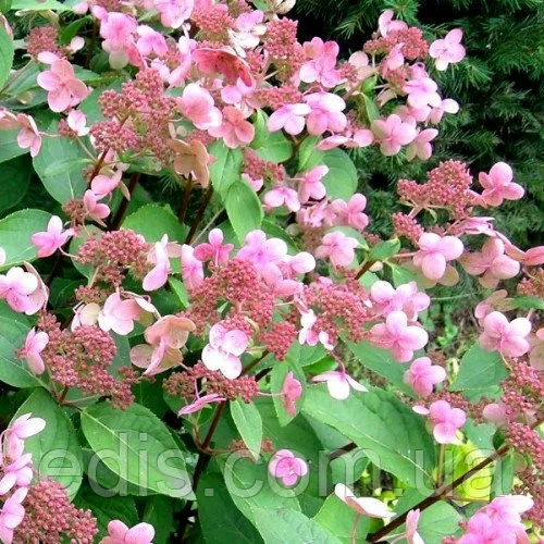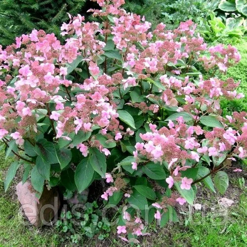 В-третіх – суцвіття у цій гортензії красиве і незвичайне, стерильні і фертильні квітки при відцвітанні мають різне забарвлення. Стерильних (великих) квіток небагато, але вони великі, на початку цвітіння кремові, з часом стають темно-рожевими. Фертильні квітки (дрібні) набувають винно-бордове забарвлення. Це поєднання рожевого і винного виглядає дуже цікаво.