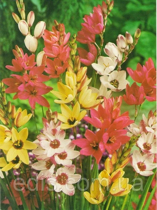 Іксія Mix Для растения предпочтительнее использовать грунт, богатый гумусом и нейтральным уровнем кислотности. Питание почвы должно быть обеспечено субстратом из дерновой земли и крупных фракций песка с торфяными включениями. Иксия – растение, которое боится холодов и резких перепадов температур. Высадку луковиц в грунт осуществляют с наступлением ровного тепла, ближе ко второй половине весеннего периода. Глубина посадки – 6 см. с расстоянием между клубнелуковицами около 3 см. Иксия зацветает в конце весны или в начале лета. Цветёт недолго (3-4 недели), но обильно. Іксія – ідеальне прикраса присадибної чи дачної ділянки. У ландшафтному дизайні успішно використовується при формуванні альпійських гірок, особливо в поєднанні з іншими цибулинними рослинами. На клумбах зоряну тропиканку розташовують по краях, де вона утворює красивий бордюр, вигідно підкреслюючи всю квіткову композицію. А зрізана квітка може простояти у воді до двох тижнів.Оплата та доставка