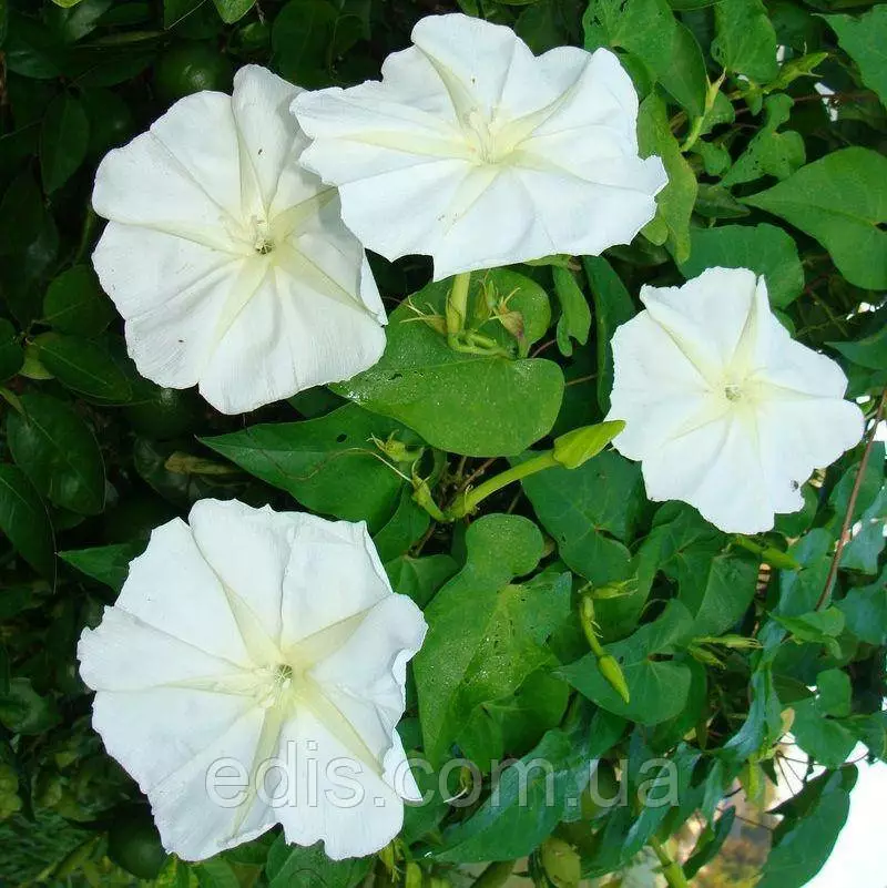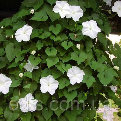 Насіння однорічних квітів: Іпомея БілаЯкщо ви обираєте квітучу однорічну рослину, здатну швидко створити досить щільну, волого- і сонценепроникну ширму на альтанці, сітчастому паркані або іншій опорі – візьміть іпомею білу. Вона невибаглива, дуже швидко росте, самостійно добре гілкується і до самих заморозків покрита чарівними білими ліхтариками-квітками з найніжнішим приємним ароматом.