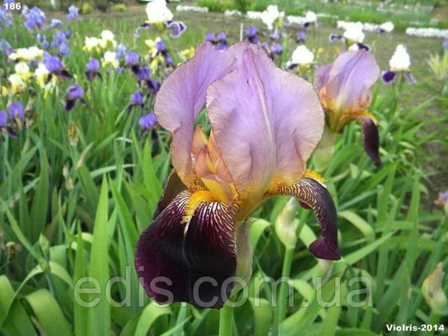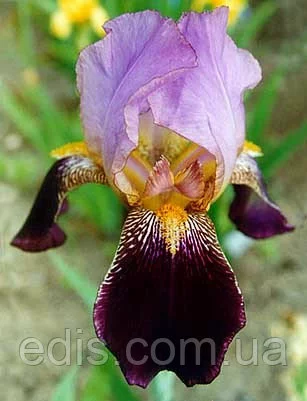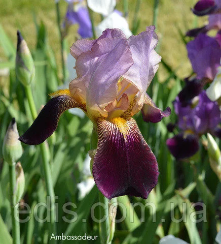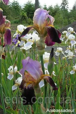 Iris Germanica (Бородатий) Ambassadeur Історичний сорт, який до цих пір користується високим попитом завдяки надзвичайно багатою забарвленням. Стандарти димчасто-лавандового кольору з жовтим підсвічуванням від підстави. Фоли оксамитові, темного, глибокого рожево-лілового кольору, від основи - цікавий малюнок фіолетових прожилок на білому тлі. Борідки. Висота: 70 см Термін цвітіння: середній. Оригінатор: Vilmorin, Франція, 1920Оплата та доставка