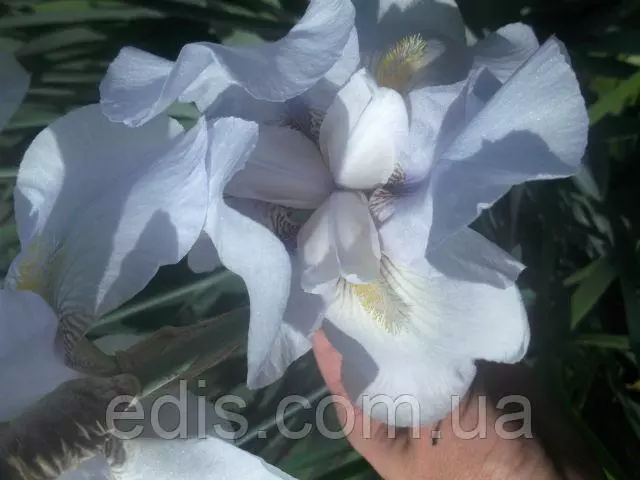 Ірис високий бородатий Фростед Старлайт Дуже гарний, високий, перевірений часом історичний сорт. Квітка велика, висота квітконосу до 120 див. Бутони палево-бузково-блакитні, розпустилася квітка вдень при яскравому сонці платиново-білий, з невеликим сітчастим малюнком і борідкою лимонно-жовтого кольору. У похмуру погоду або при легких сутінках блакитно-бузковий відтінок просвічує більш виразно. Сорт відрізняється відмінною стійкістю до хвороб і шкідників, хорошим коефіцієнтом розмноження і рясним цвітінням.Оплата та доставка