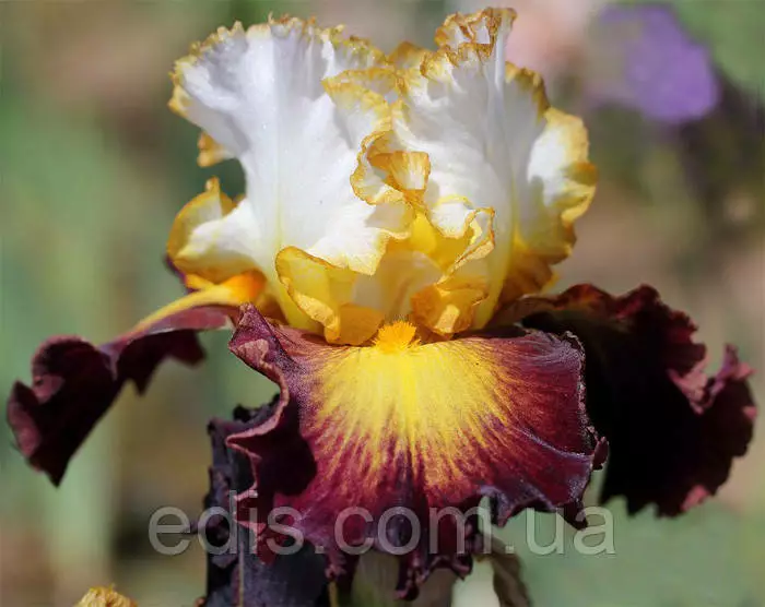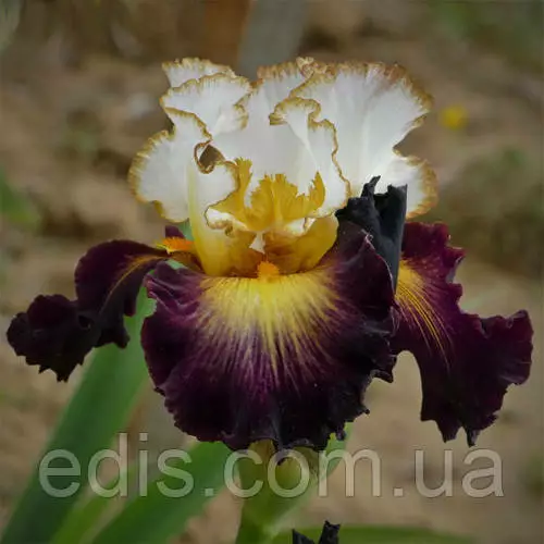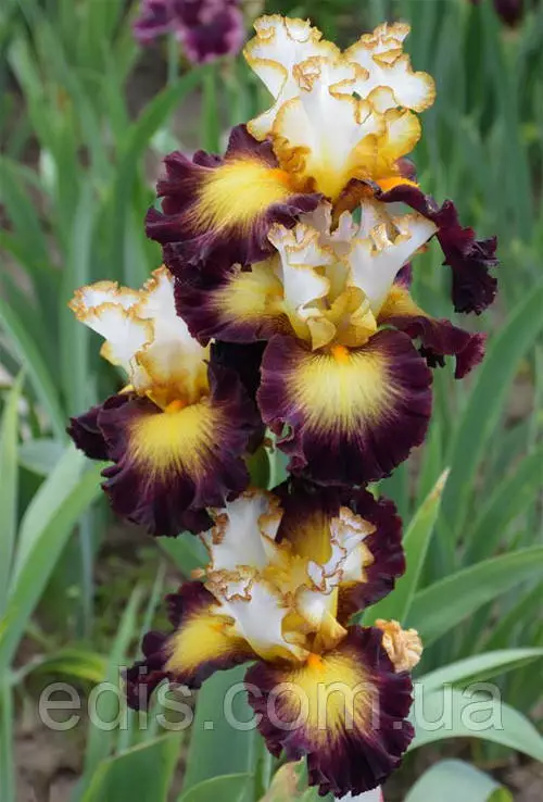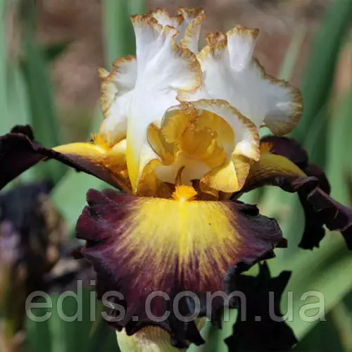 Стандаоты белые, воздушные с тонкой окантовкой золотой охры. Широкие фолы черно-бордового цвета с большим солнечным отливом, который стремится к золотым бородкам. Лёгкие кружева и пузырчатые волны по лепесткам.