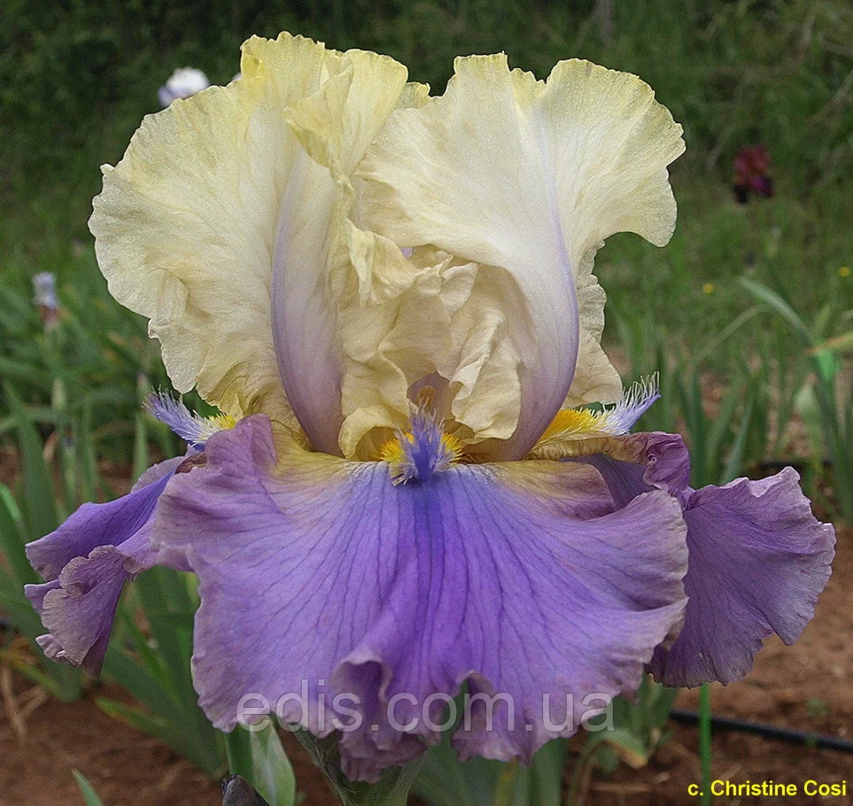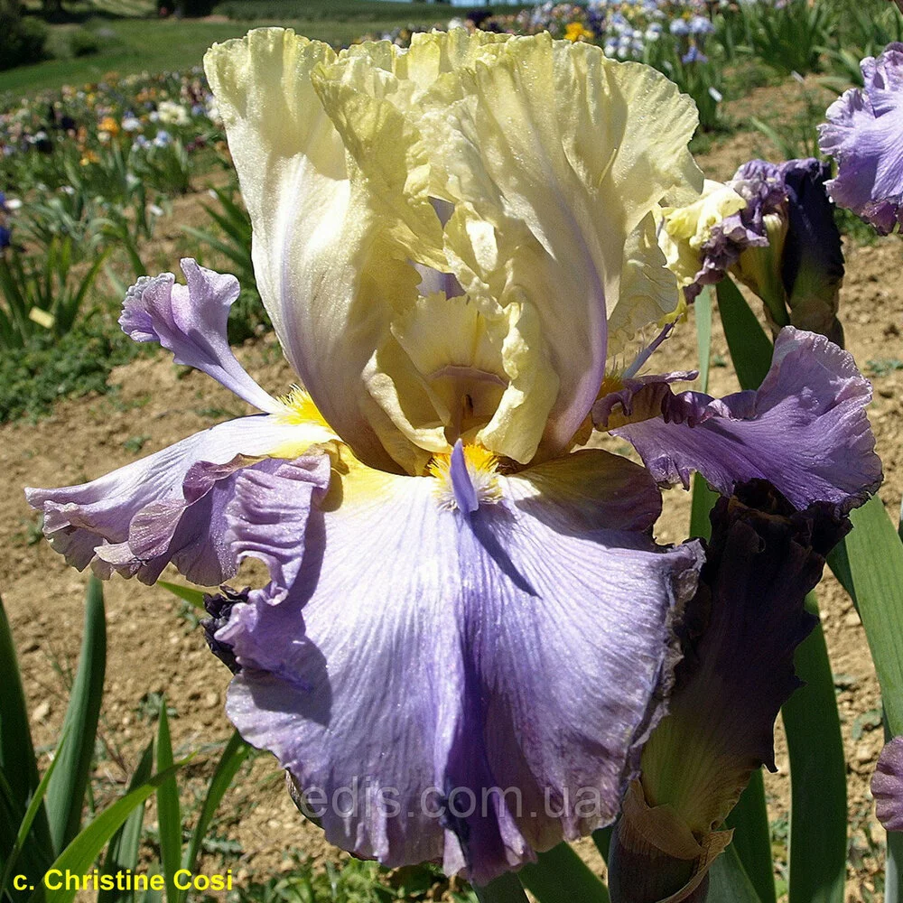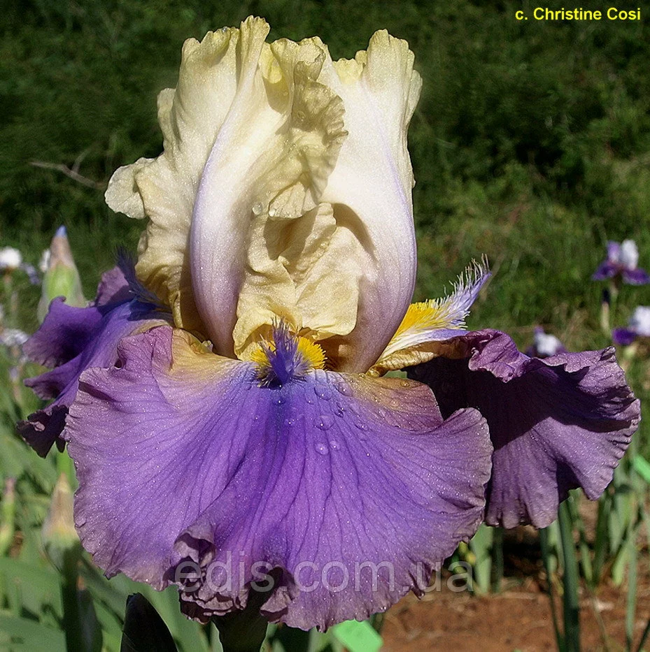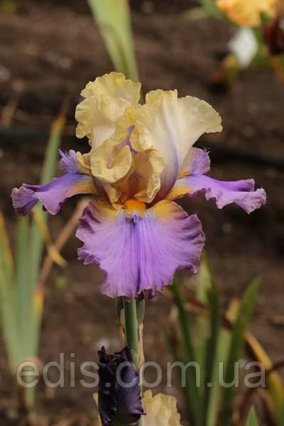 Саджанці садових квітів Ірису високий бородатий Mist ArisingНазва цього ірису в перекладі означає Висхідний туман. Квітки великі, мереживні з дивовижними ріжками на кінцях борідок! Стандарти кольору шампанського з лавандовим напиленням по спинці центральної прожилки. На димчасто-лавандових стандартах гірчичні плечі вертикальна темна доріжка по центру. Борідки яскраві помаранчеві з синьо-фіолетовими ріжками 2-3 см завдовжки.