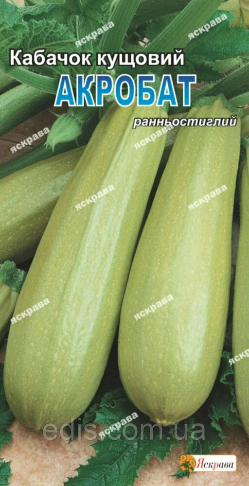 Кабачок Акробат 3 рСорт ранньостиглий, придатний для використання в консервації і кулирании. Вегетаційний період до настання технічної зрілості 38-42 днів. Рослина сорту середньої міцності з компактним кущем. Стебло жорсткий, з гострими шипами. Плід циліндричної форми з незначною ребристістю у плодоніжки, блідо-зеленого кольору, в біологічній стиглості - жовтого. Середня маса плоду 350 р.Оплата та доставка