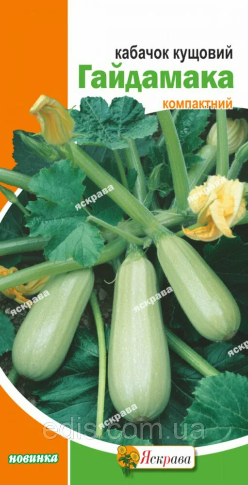 Кабачок Гайдамака 3 г Раннеспелый сорт для открытого и закрытого гунта. Период от всходов до технической спелости 36-45 дней. Растения кустового типа, боковые побеги короткие. Плод гладкий, цилиндрический, у основания слаборебристый, белесого цвета, массой 500-900 г. Мякоть кремово-белая, средней плотности, хорошего вкуса. Сорт ценится за устойчивость к бактериозу и высокую транспортабельность. Рекомендуется для переработки, консервирования и соления.Оплата та доставка