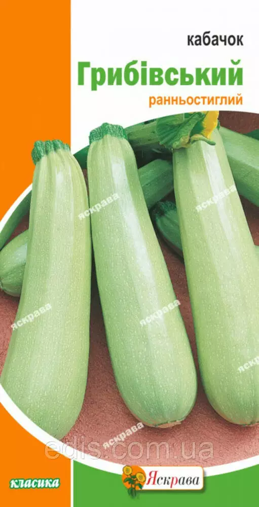 Кабачок грибовський 3 р Середньорання, урожайна культура. Рослина кущова. Плід циліндричний з гладенькою шкірою світло-зеленого кольору. Цінний дієтичний продукт. Плоди збирають недозрілими довжиною 12-20 см для широкого використання в консервній промисловості і домашній кулінарії.Оплата та доставка