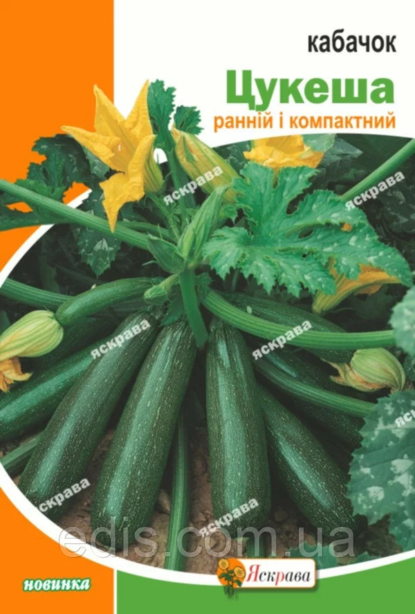 Кабачок Цукеша 20 гСкоростиглий, високоврожайний сорт. Вегетаційний період від сходів до початку плодоношення 40-45 днів. Кущ компактний, без бічних пагонів. Плоди циліндричної форми з гладкою поверхнею, темно-зелені з маленькими білими цяточками, довжиною 30-35 см, діаметром 12 см, масою близько 1 кг М'якоть біла, хрустка і ніжна. Використовують для соління, маринування та приготування кулінарних страв. Рекомендується для вирощування в плівкових теплицях.Оплата та доставка