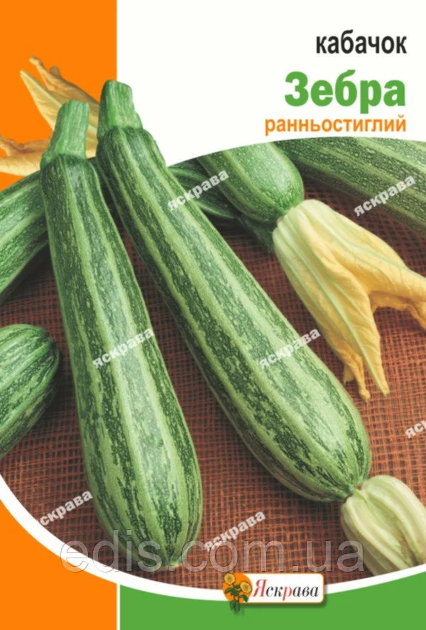 Кабачок Зебра 20 гРанньостиглий урожайний сорт невибагливий. Кущовий Сорт. Плід довгий з гладкою шкіркою , зеленого кольору зі смужками. Плоди збирають незрілим, довжиною 12-20 см, для широкого використання в консервній промисловості і домашній кулінарії. Циниться, як дієтичний продукт. Тепло - і світлолюбна культура. Оптимальна температура для росту 18-23 С. Сіють при прогріві 10 см шару ґрунту до 6-8 С. Норма посіву - 2-3 насінини на 1 пог.м з шириною міжрядь 70-90 див. Глибина закладення до 5 см. Для отримання ранньої продукції висаджують 20-40 - денною розсадою, яку вирощують в горщиках.Оплата та доставка