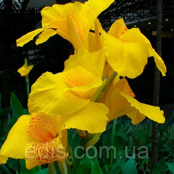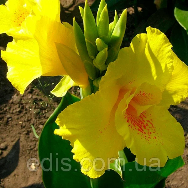 Бульби та цибулини квітів: Канна Richard WallaceРічард Уоллес - один з найцінніших сортів канн. Відрізняється великими, яскравими квітками, яких на стеблі не менш 5 шт. Висота 90 см. Листя зелене. Квітка яскраво-жовта з оранжевим штрихуванням в горлі..