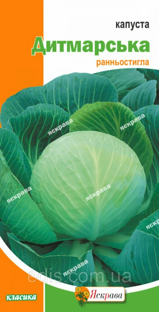 Капуста білочана Дитмарська 0,5 г Капуста Дитмарська — ранній сорт, що вирізняється гарною врожайністю, за умови дотримання всіх правил висівання насіння в гунт і подальшої висадки розсади. Ціна посадкового матеріалу абсолютно доступна. Дешеве купити товар в онлайн-режимі пропонує компанія «Едіс». Зателефонуйте нашим консультантам, щоб замовити доставку насіння капусти в Одесу, Київ, Львів, Дніпропетровськ або інше місто в Україні. Вартість послуги визначається компанією-перевізником, хоча в будь-якому разі ви зможете недорого отримати свою посилку за вказаною в заявці адресу. Щоб вирощування культури було вигідним: потрібно висівати насіння на глибину 0,5-1 см; дотримуйтеся витрати посадкового матеріалу — 10-12 г/100 м2; висівання виготовляєте за 45-50 днів до висаджування розсади в ґрунт. Скориставшись порадами фахівців нашого інтернет-магазину, ви зможете отримати високий урожай капусти за мінімуму зусиль.Оплата та доставка