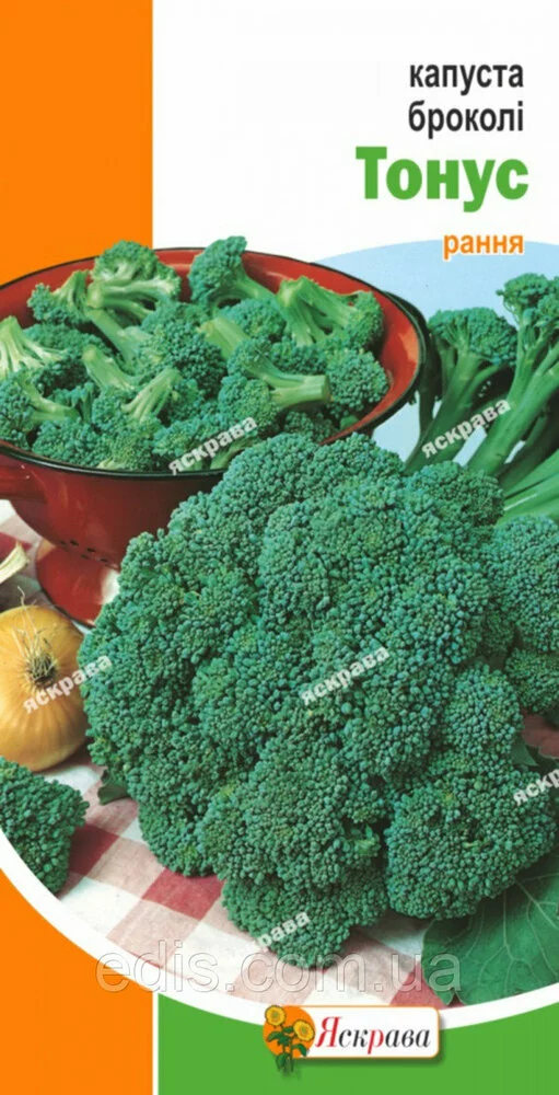 Капуста брокколі Тонус 0,3 гРанньостиглий сорт. Вегетаційний період від сходів до технічної стиглості 80-90 днів. Головка велика, темно-зелена, середньої щільності, масою 200-250 р. Після зрізу швидко відростає до 7 бокових головок. Врожайність - 1,5-2 кг/кв. м. Сорт цінується за одночасне дозрівання плодів. Використовується в кулінарії, а також для консервування.