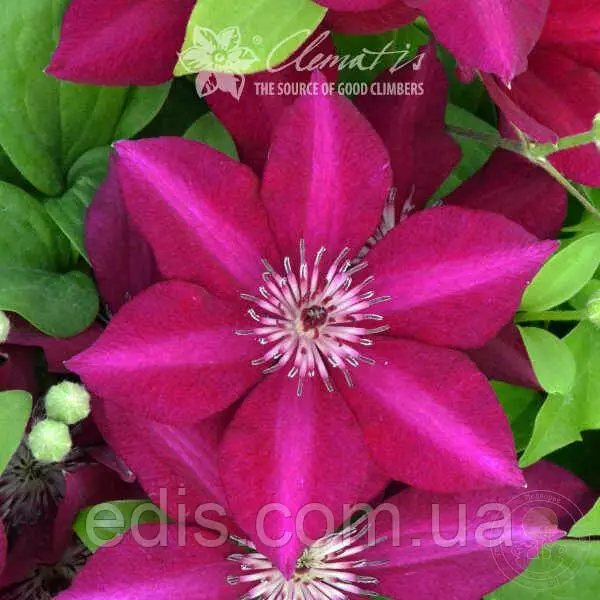 Саджанці декоративних садових ліан: Клематіс Perida (Періда)Благородне винно-червоне забарвлення квіток, безперервне тривале цвітіння та компактність куща роблять клематис Періда "універсальним солдатом" для яскравого акценту біля вхідної зони, терасових контейнерів, балконних контейнерів, де не підходять дуже великі рослини.