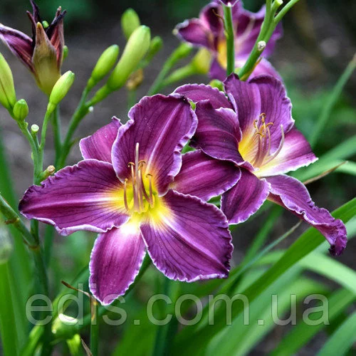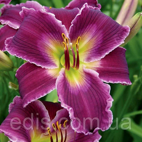 фіолетові пелюстки з лавандового окантовкою по хвилястому краю, салатова горло;
