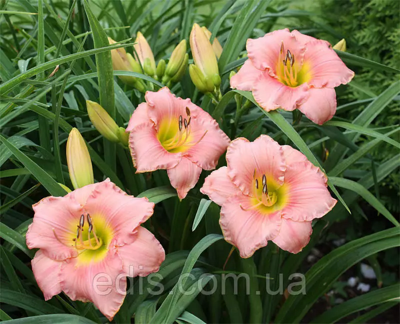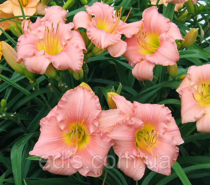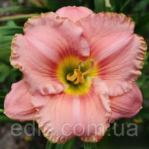 Саджанці садових багаторічних квітів: Лілейник Сплендід ТачКласичний сорт лілійнику з яскравими квітками. Основне забарвлення квітки креветочно-рожевий, вічко коралово-червоний, горло золотисто-жовте або салатово-жовте. Квітка округлий, 9-10 см в діаметрі, з гофрованого одноколірної окантовкою.